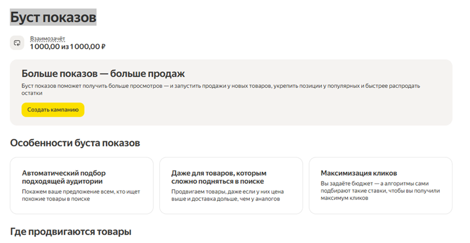 Как только товары получат статус софинансирования, имеет смысл настроить Буст показов. Это платное продвижение повышает видимость товаров на площадке и помогает быстрее привлечь покупателей, усиливая эффект от совместных скидок.
