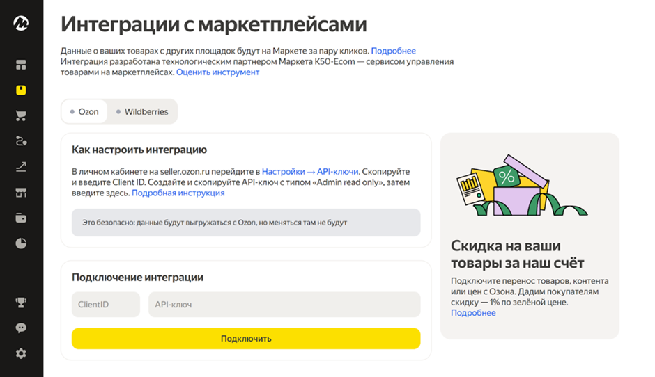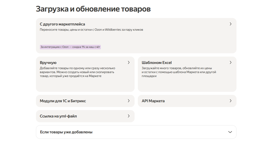 Для многих предпринимателей Яндекс Маркет не становится первой площадкой: бизнес может быть уже представлен на Ozon, Wildberries или в собственном интернет-магазине. Чтобы не тратить время на ручную загрузку каждой карточки, предусмотрена возможность автоматической интеграции.