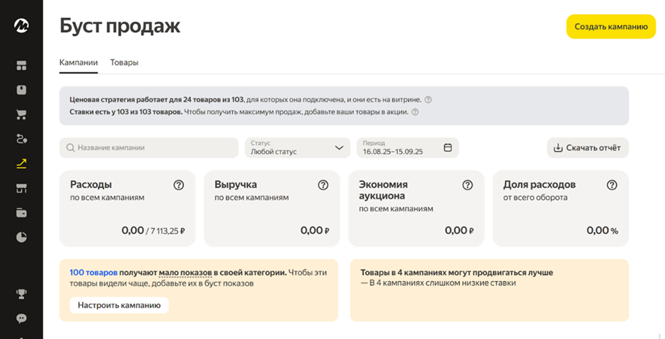 Буст продаж — простой инструмент, который помогает быстрее привлечь внимание к товарам и увеличить продажи. Особенно полезен на старте работы с Яндекс Маркетом. Результаты буста можно отслеживать через стандартные метрики: показы, заказы, конверсию и позиции в поиске.