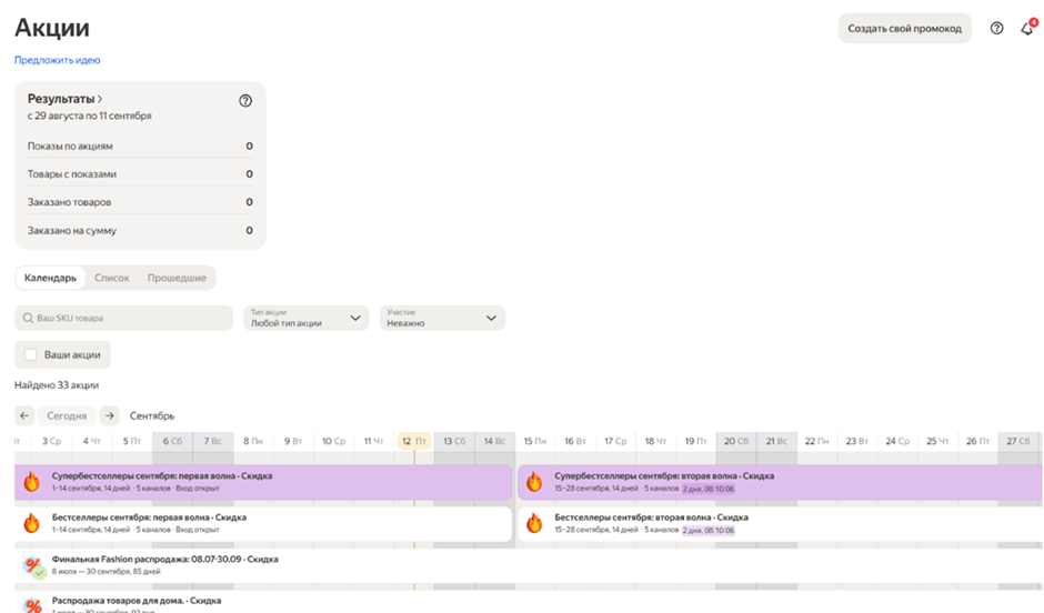 - Зайдите в календарь акций в разделе «Продвижение».