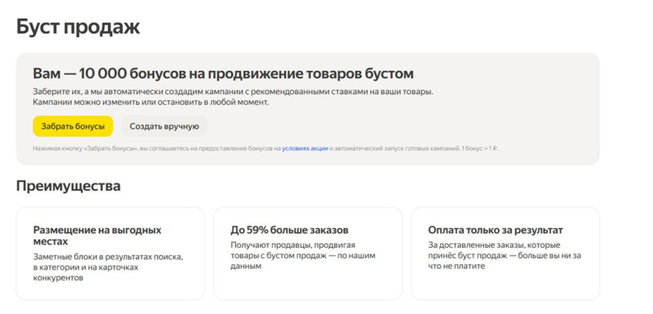 В подарок 10 000 бонусов на продвижение товаров бустом при регистрации магазина на Яндекс Маркете.