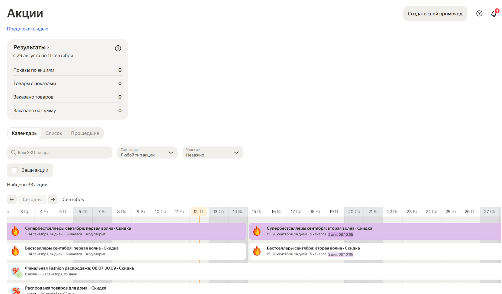 Важно: как только товары появятся в каталоге, добавляйте их в подходящие акции. Это один из самых быстрых способов ускорить первые продажи, так как акции дают товарам дополнительную видимость, привлекают новых покупателей и помогают вывести позиции в топ выдачи.